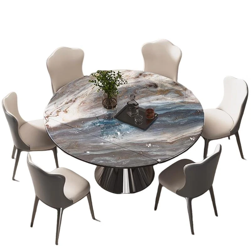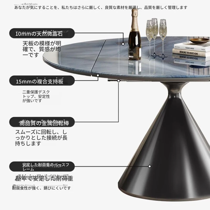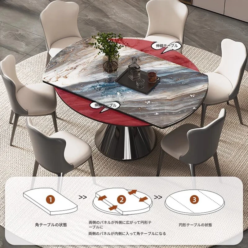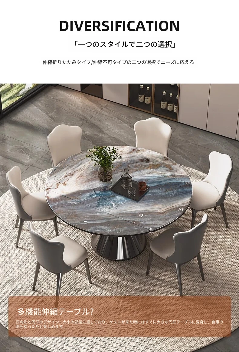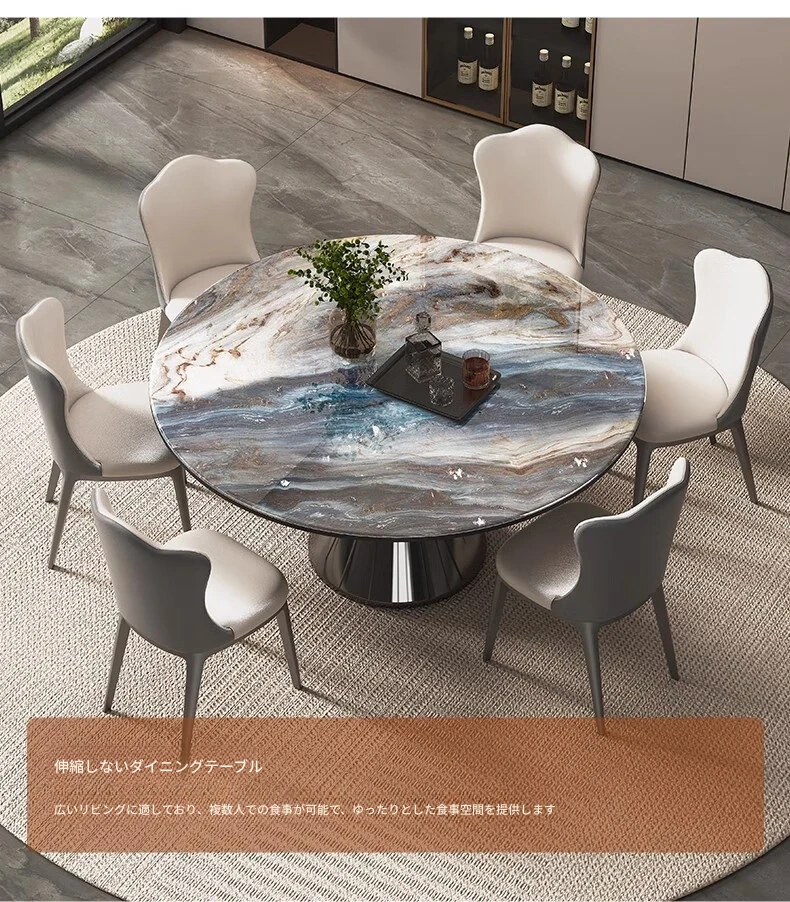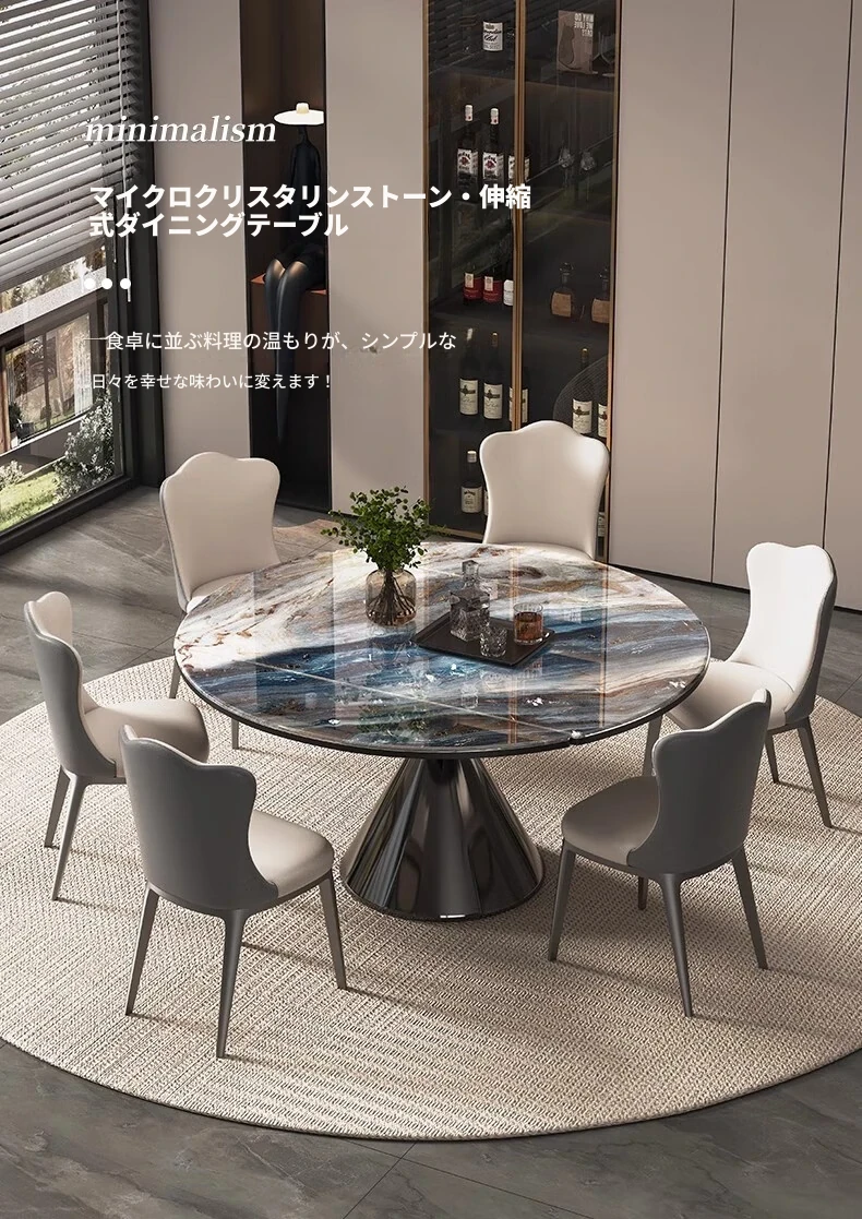 イタリアンミニマルデザインの全脚サポート付きダイニングテーブルセット、超クリスタルストーン製のラグジュアリーな円形テーブル。伸縮可能で回転式、家族みんなで快適に食事を楽しめるマイクロクリスタルストーン製のテーブルです。