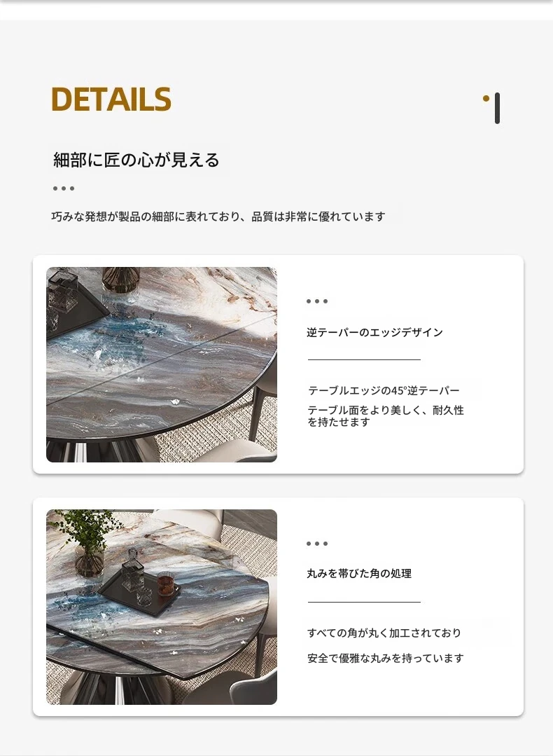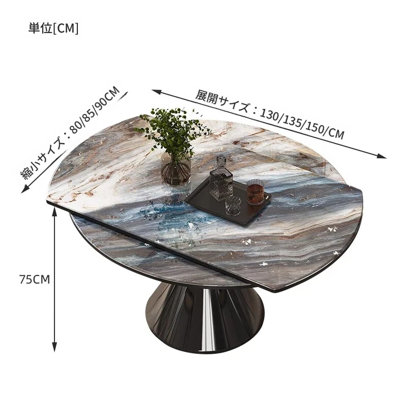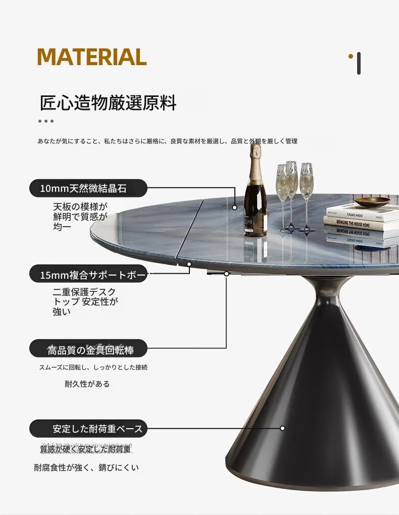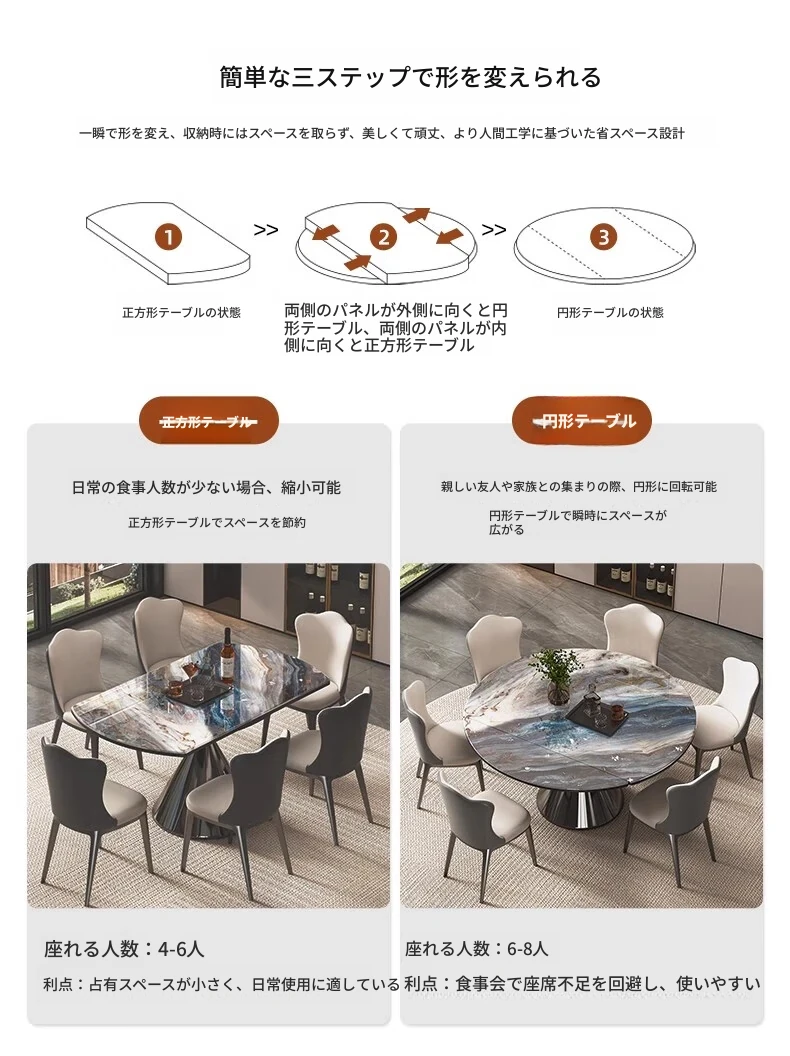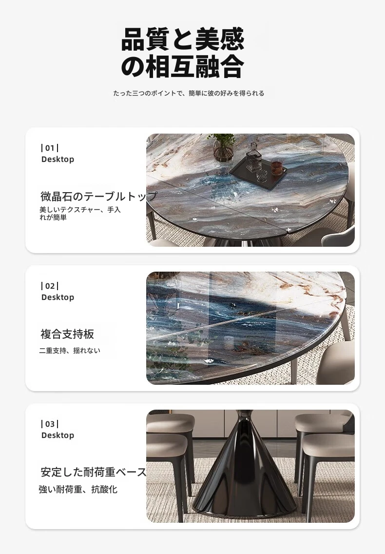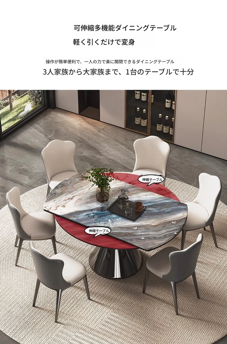 イタリアンミニマルデザインの全脚サポート付きダイニングテーブルセット、超クリスタルストーン製のラグジュアリーな円形テーブル。伸縮可能で回転式、家族みんなで快適に食事を楽しめるマイクロクリスタルストーン製のテーブルです。