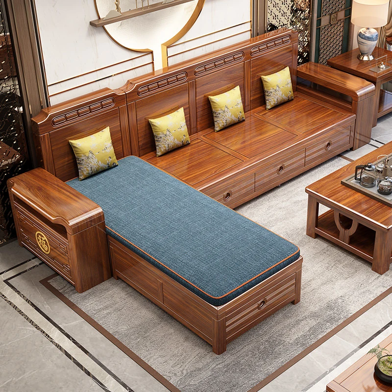 モダンミニマリストのウォールナット無垢材ソファベッド、引き出し付きでスライド可能!小さなリビングルームに最適な収納ソファ。快適さとスタイルを両立させた一品です。